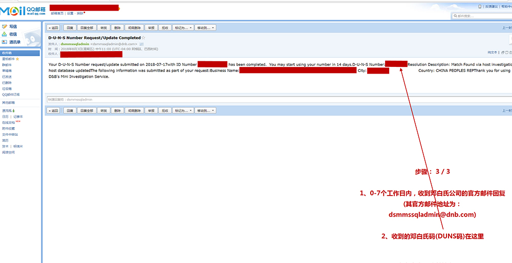第二步:0-7個工作日,收到對方的郵件回復,具體內容下圖所示;然后繼續等待“鄧白氏公司” 的官方郵件回復(發件地址為:dsmmssqladmin@dnb.com)