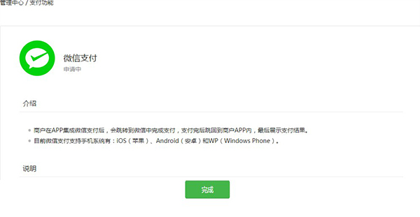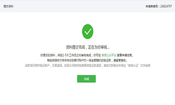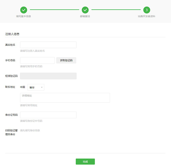 3.激活郵件后,在完善開發者資料頁面中根據提示填寫對應信息,需要注意的是掃碼驗證管理員身份時,需使用綁定了注冊人本人銀行卡的微信掃描二維碼。否則不通過。點擊“完成”后,注冊完畢。