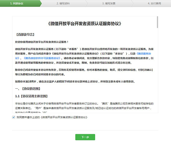 5.勾選“我同意并遵守上述的《微信開放平臺開發者資質認證服務協議》”,點擊“下一步”。