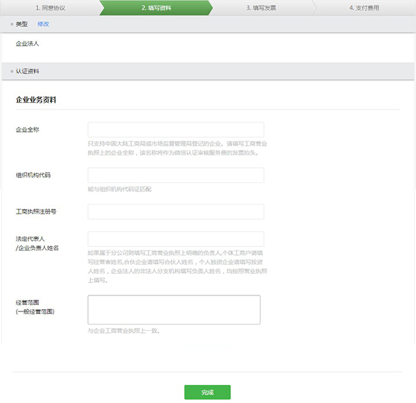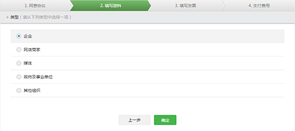 6.選擇“企業”后點擊“確定”按鈕。開始進入填寫資料頁面,必須真實的填寫好相關的信息后點擊“下一步”進入填寫發票頁面,填寫好相應的信息后點擊“下一步”進入支付費用頁面,支付費用 300 人民幣,支付完費用后提交審核。等待 1-2 個工作日即可看到審核結果。