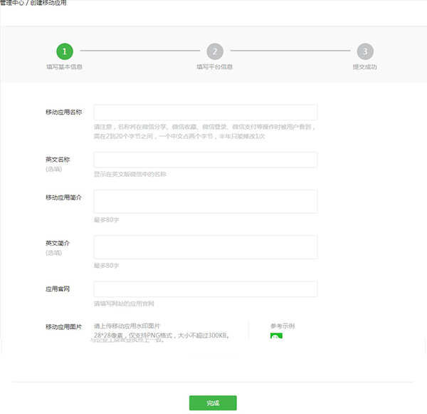 8.登錄進入微信開放平臺后,點擊管理中心,在管理中心頁面中選擇創建移動應用,填寫上移動應用的相關信息后,提交即可進入等待微信審核的過程中,審核時長大概 2-3 個工作日。