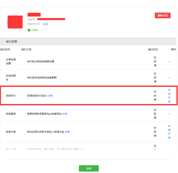10.在應用詳情頁面找到“微信支付”一欄,點擊“申請開通”按鈕。在申請開通頁面可以看到微信支付是未開通的狀態,點擊“開通”進入提交資料頁面。
