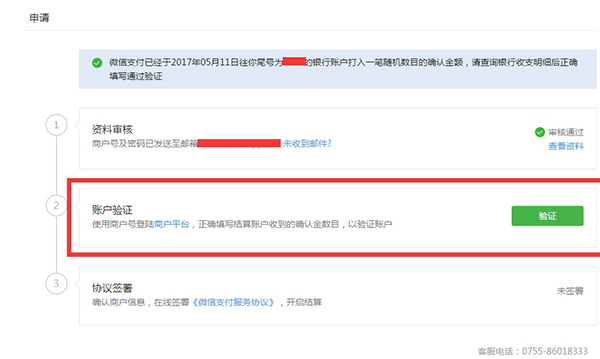 13.當在你的申請進度中看到賬戶驗證出現驗證按鈕的的時候說明你的支付渠道申請工作離結束已近在咫尺了。點擊驗證按鈕頁面會跳轉到微信的一個商戶平臺,注意這個商戶平臺的商戶號和商戶平臺登錄密碼是發送到你提交資料時填寫的郵箱里了,登陸你所填寫的郵箱, 查看一下是否有微信給你發送的一封關于商戶平臺的郵件,里面就記錄了商戶號和商戶平臺登錄密碼,另一個商戶平臺登錄賬號在登陸時可以不用。