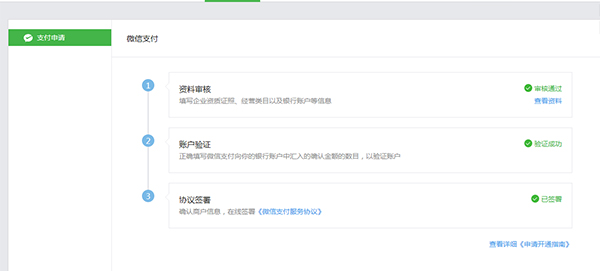 15.賬戶驗證通過后,最后一步就是協議簽署,點擊簽署協議會進入一個列有微信支付服務協議的頁面,協議文字非常多,有興趣慢慢看,沒興趣直接選擇“我接受”即可完成。完成 后的樣子是下圖這樣的。至此微信支付渠道申請工作結束!!!總結:支付渠道申請路漫漫,且行且珍惜!