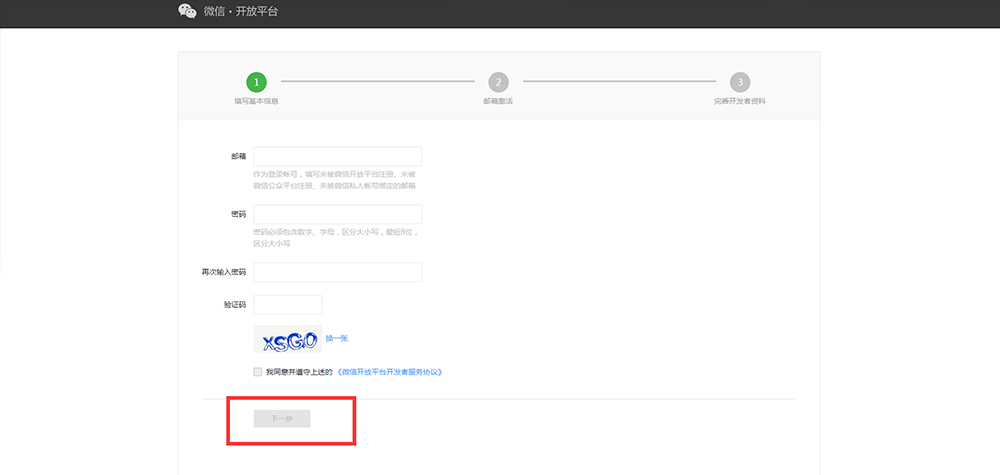 2.在注冊頁面根據提示填寫對應的信息,填完后點擊“下一步”。會給你剛注冊的郵箱發送一份郵件,登錄您的郵箱,找到該郵件激活賬號。