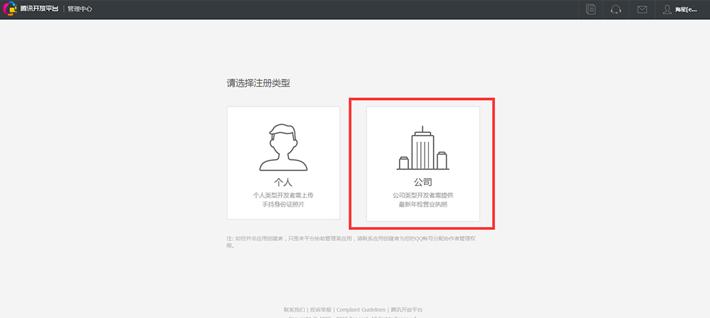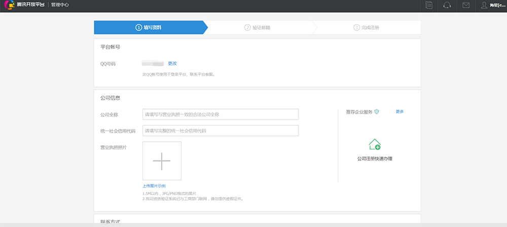 4.選擇公司進入填寫資料頁面,將公司信息、聯系方式填寫上,勾選上同意接受后點擊下一步,驗證郵箱信息后完成注冊,將企業信息提交上去后等候官方的審核通知;