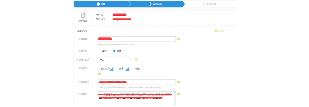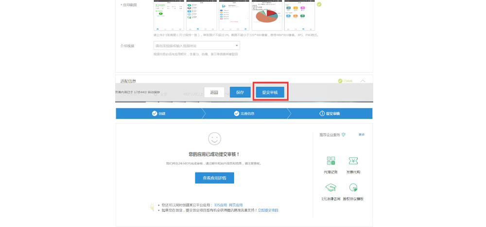 10.填寫上應用的基本信息、適配信息、上傳應用安裝包和其他信息后,點擊“提交審核”,就等著官方的審核結果。一般應用沒有什么違法的信息(如含有一元奪寶信息內容或其他違法內容)都可以審核通過。
